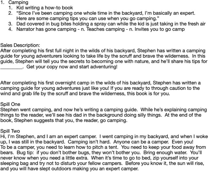 You should be feeling pretty comfortable with the direction and flow of your story now. To wrap up the summarization stage, you will need to write one more spill. This time, the goal is to tell the story to entertain.
