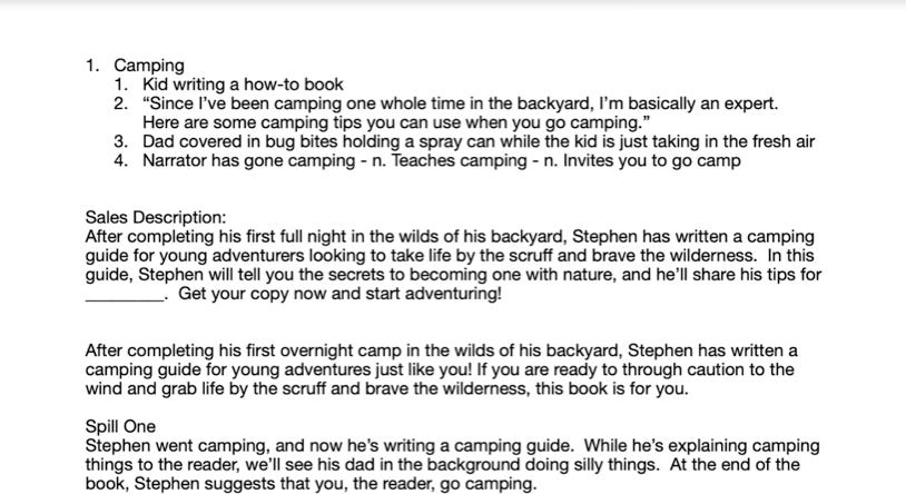 Spill One reads like this: Stephen went camping, and now he’s writing a camping guide. While he’s explaining camping things to the reader, we’ll see his dad in the background doing silly things. At the end of the book, Stephen suggests that you, the reader, go camping.